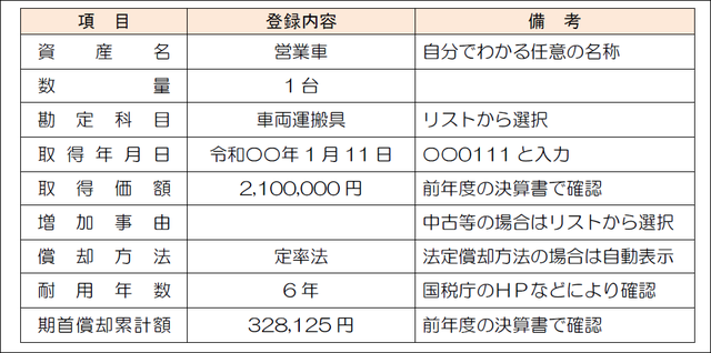 減価償却を行うに当たって必要なことは、次のような項目になります。