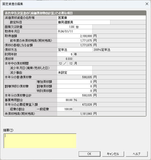 上の金額は、計算方法を定率法、事業専用割合を80%にした例です。