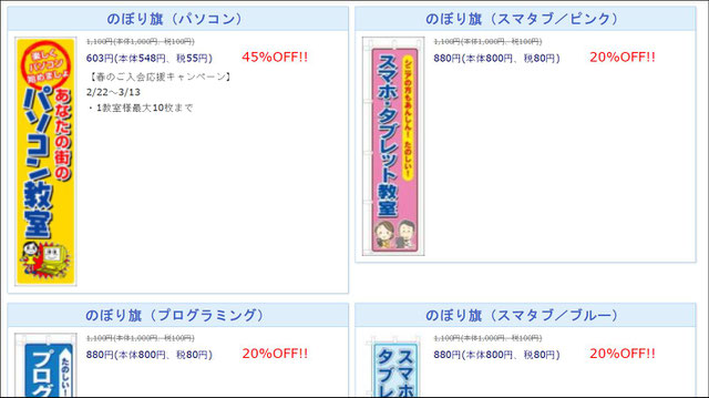 かねてご案内をさせていただきましたように、本日0:00:00より、「春期募集応援キャンペーン」としまして、パソコン教室用のぼり旗を「3.150(さー!いこー!)割にさせていただいております。